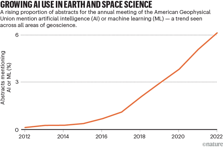 美国地球物理联盟 (AGU) 的跟踪报告进一步揭示了 AI 工具的广泛应用,从 2012-2022 年,摘要中提到 AI 的论文数量呈现指数级增长,这凸显了其在天气预报、气候模拟、资源管理等方面的巨大影响。