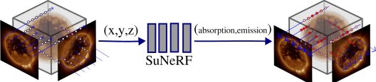 修改 NeRF 模型:调整 NeRFs 模型以适应太阳的物理实际,用发射和吸收系数取代 NeRF 模型对密度和颜色的预测。