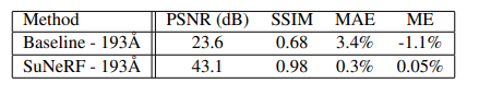 质量评估:图 (a) 展示了模拟中每个视点的峰值信噪比 (PSNR) 和结构相似性 (SSIM) 。 SuNeRFs 提供了高质量的结果,最小 SSIM 为 0.97 。接近黄道面的点显示最小误差,而随着纬度增加,误差逐渐增加,符合训练-测试拆分的预期。
