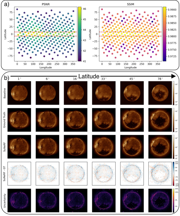 模型比较:图 (b) 将模型与基线方法进行了比较。在较高纬度,简单的重投影显示出伪影和与真实情况较大的偏差,而 SuNeRF 模型呈现几乎相同的图像。差异图显示主要错误发生在太阳边缘附近和边缘区域,这也反映在不确定性图中。需要注意的是,重投影方法无法处理边缘区域。