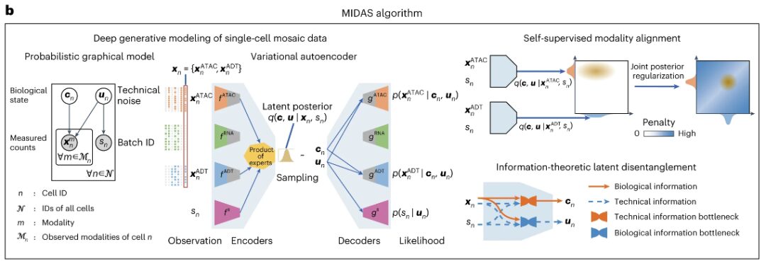 MIDAS 基于变分自动编码器 ( variational autoencoder, VAE) 的架构,具有模块化的编码器网络及解码器网络,前者能够处理马赛克输入数据并推断潜在变量,后者能够使用潜在变量启动观察数据的生成过程。 MIDAS 使用自监督学习来在潜在空间中对齐不同的模态,改善下游任务中的跨模态推断,例如插值和翻译。同时还应用信息论法来解耦生物状态和技术噪声,进一步实现批次校正。