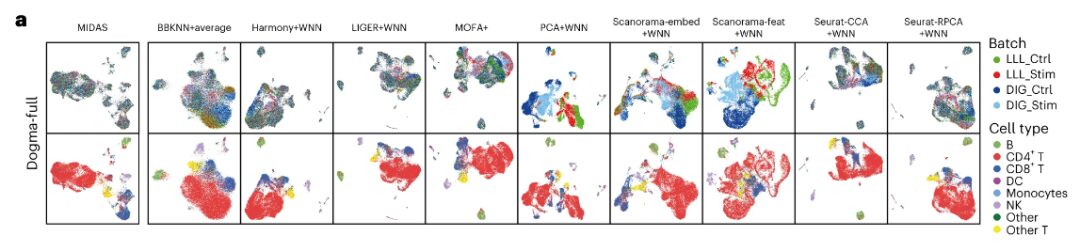 在消除批次效应和保存生物信号方面——研究团队将 MIDAS 的性能与近期发表的 9 种方法进行了比较。