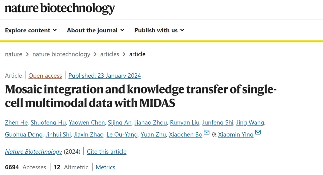 为了攻克这一挑战,近期,军事医学研究院应晓敏团队和伯晓晨团队在 Nature Biotechnology 期刊发表了题为「Mosaic integration and knowledge transfer of single-cell multimodal data with MIDAS」的研究论文。该研究提出了一种用于单细胞多组学 (single-cell multimodal omics,scMulti-omics) 数据马赛克式整合(即不同数据集仅共享部分检测模态)及知识迁移的计算工具 MIDAS,基于自监督学习 (self-supervised learning) 和信息论方法 (information-theoretic approaches) 首次实现了通用的单细胞多组学马赛克数据的模态对齐、数据补全、批次校正等整合功能,为构建大规模多组学细胞图谱、实现大规模单细胞多组学分析与知识迁移提供了重要的原创技术。