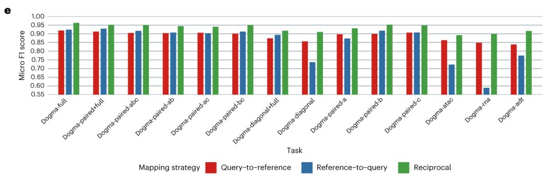 在知识迁移能力方面——研究人员将每个查询数据集与参考数据集对齐,并通过 k-nearest neighbors (kNN) 算法转移细胞类型标签。将生物状态进行映射并可视化后可以看到,不同查询数据集的互参映射结果一致,并与通过 dogma-full 数据集获得的图谱整合结果高度一致。 MIDAS 实现了稳健且准确的标签传输,从而避免了从头集成和下游分析的需求。因此,MIDAS 可用于将图集级知识转移到各种形式的用户数据集,而无需昂贵的从头训练成本或复杂的下游分析。