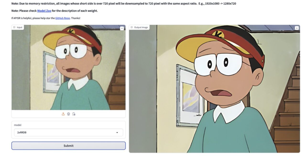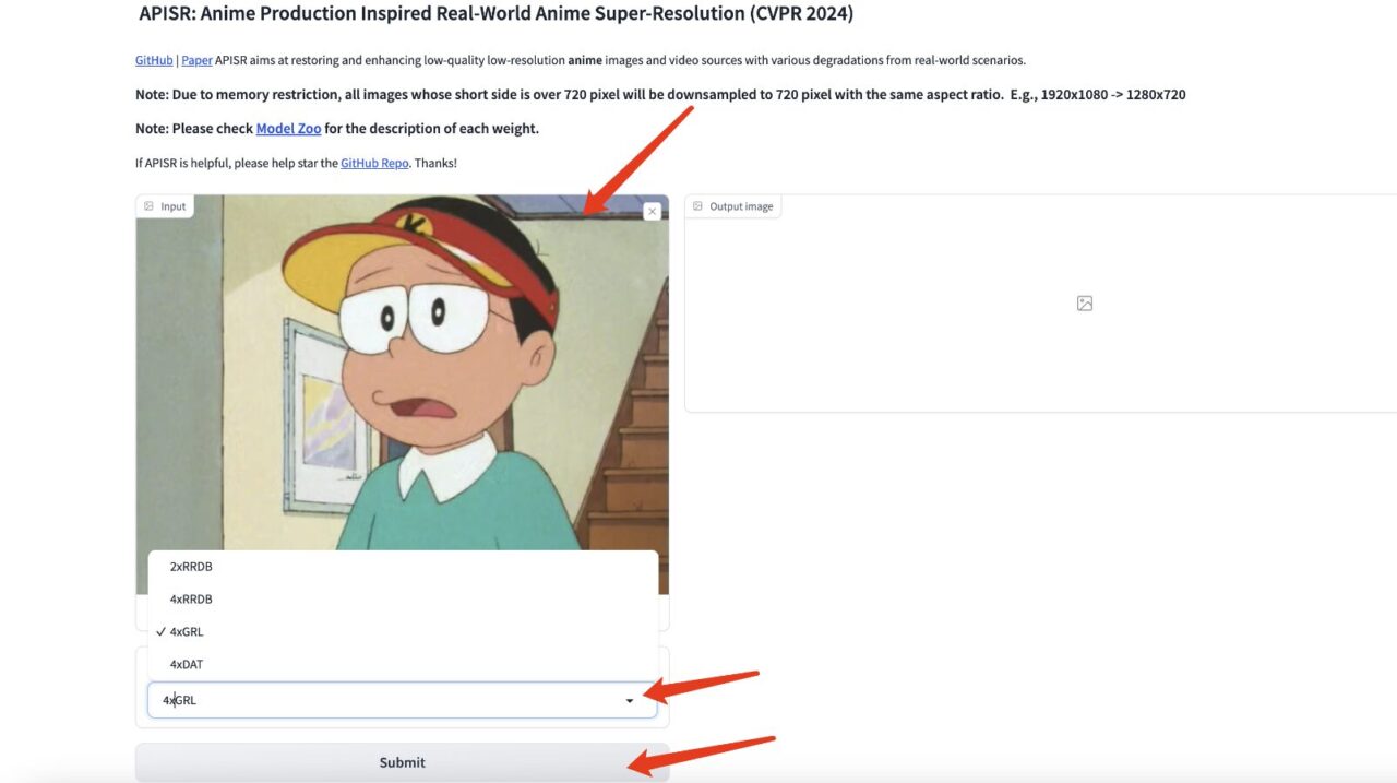 1. 打开 APISR 页面,导入图片,选择模型,点击「Submit」,即可生成超分辨率图像。