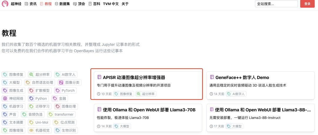 为了减少大家的模型下载时间,简化 APISR 使用流程,HyperAI 超神经官网现已上线「APISR 动漫图像超分辨率增强器」教程,点击即可一键部署。