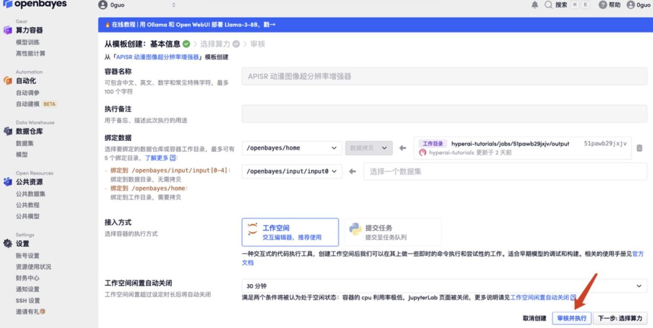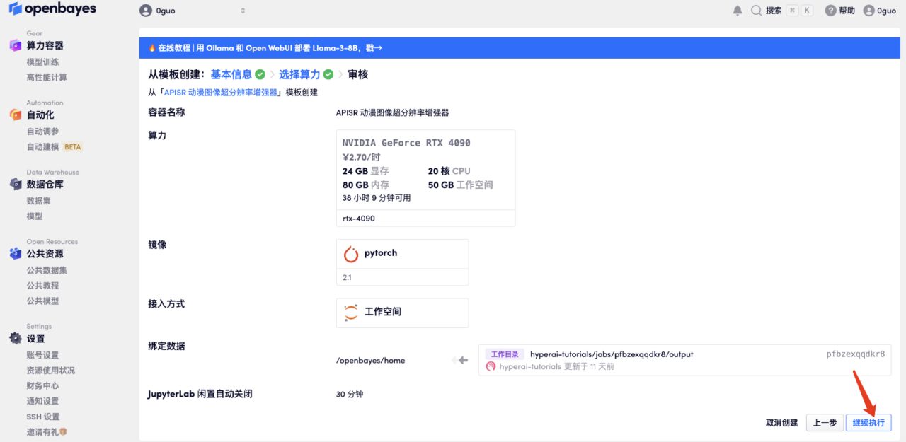 2. 页面跳转后,点击「克隆」,点击「审核并执行」,点击继续执行。新用户使用下方邀请链接注册,可获得 4 小时 RTX 4090 + 5 小时 CPU 的免费算力时长!