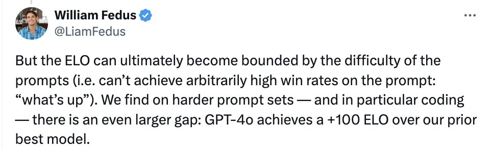 他还介绍道,在更难的提示集上、尤其是在编码能力上,GPT-4o 的水平比 OpenAI 此前最先进的大模型高出 +100 ELO 。
