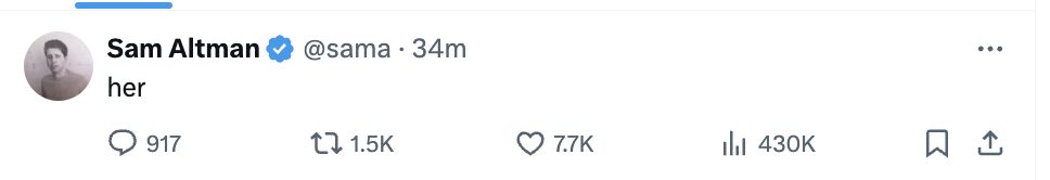 随后,Altman 还在其账号发布了「her」,也暗示了自己新版模型将开启「Her 时代」。