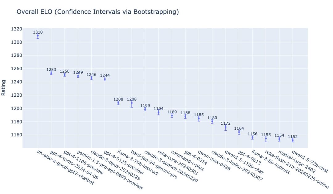 OpenAI 的 William Fedus 晒出了 GPT-4o 在 LMSys 榜单上的排名情况,团队给 GPT-4o 的命名也很有意思:im-also-a-good-gpt2-chatbot 。