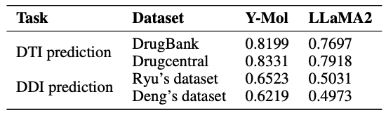 同时,为了对 DDI 预测的性能进行评估,研究者们采用了 Ryu 和 Deng 提供的数据集。这些评估方法经过精心选择,确保 Y-Mol 能在药物研发领域的行业标准下得到公正和全面的检验,证明其有效性。