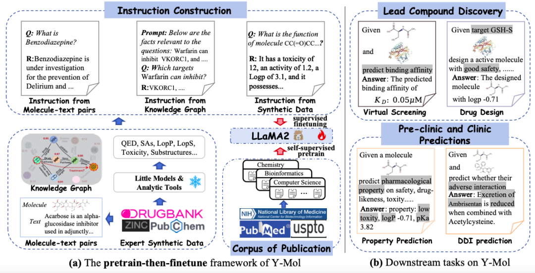 该研究选用了 LLaMA2-7b 作为基础的大语言模型,进而构建一个专门用于药物研发的高级训练和推理框架——Y-Mol 。如下图所示,Y-Mol 的开发分为两个关键阶段: