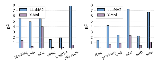 在分子属性预测中,如下图所示,Y-Mol 在所有任务中都展现出比 LLaMA2 更低的 R² 分数,这表明 Y-Mol 在预测理化属性方面具有更强的泛化能力。