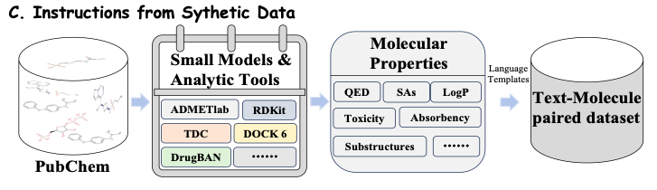 此外,为了获取基于药物属性和领域知识的大规模指令,该研究利用现有小模型的专家合成数据构建指令,将药物知识谱提炼到 Y-Mol,最终,该研究汇集了 1,120 万个语料库条目和 230 万个精心设计的指令。