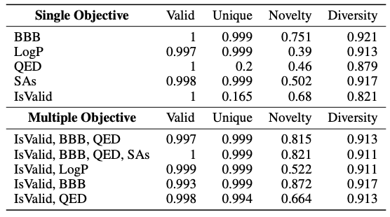 如下表所示,该研究引入 Valid 、 Unique 、 Novelty 、 Diversity 等标准指标,对 BBB 、 LogP 等不同的单一目标 (Single Objective) 进行预测。结果表明,Y-Mol 整体性能更好,相比之下,只有 LLaMA2-7b 模型的结构域适应能力表现不佳,无法生成有效的分子。同时,该研究还同时测试了多重目标 (Multiple Objective) 下 Y-Mol 的药物设计性能。结果表明,Y-Mol 在这种情况下也表现良好。