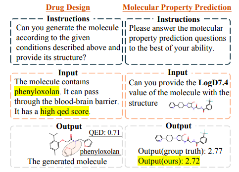 该研究精心设计了多样化的指令集,对 Y-Mol 进行细致的微调,这些指令包括了分子文本对的说明 (Instructions from Molecule-text Pairs),以及从药物数据库中提取的描述 (Descriptions from drug databases),这些描述以自然语言的形式呈现了药物的属性、结构和功能,蕴含了丰富的语义信息,有助于加强人类与大语言模型在药物实体感知上的一致性。