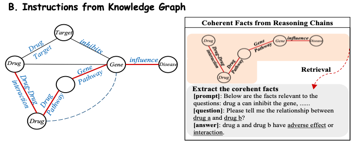 为了从生物医学知识库中高效提取领域知识,该研究将知识库中的事实转化为自然语言提示。如下图 B 所示,该研究认为子图中的每个推理链 (Reasoning Chains) 都具有明确的关系语义,因此提取了每个连贯的路径 (Pathway),并使用精心设计的模板将其转换为自然语言描述,作为提示上下文。然后,该研究将这些构建的上下文与相应的问题结合,输入到 Y-Mol 中,以输出有监督的答案。