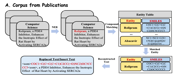 为了深入挖掘出版物中丰富的生物医学知识,该研究从在线出版平台(如 PubMed)中提取并预处理了超过 3,300 万份涵盖多个学科的出版物。如下图 A 所示,研究人员从这些出版物中提取了可见的摘要和简介,将其作为生物医学文本数据 (Reconstructed Text),确保语料库的质量和相关性。
