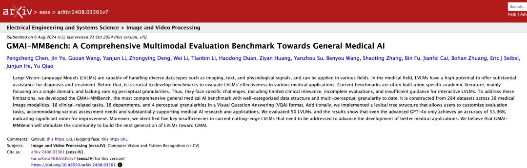 相关研究以「GMAI-MMBench: A Comprehensive Multimodal Evaluation Benchmark Towards General Medical AI」为题,入选 NeurIPS 2024 Dataset Benchmark,并在 arXiv 发表预印本。