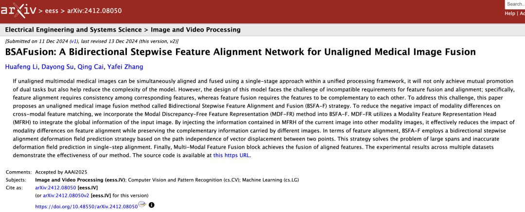 其中,一篇由昆明理工大学信息工程与自动化学院李华锋、张亚飞、苏大勇团队和中国海洋大学信息科学与工程学部计算机科学与技术学院蔡青共同研究的课题——「BSAFusion: A Bidirectional Stepwise Feature Alignment Network for Unaligned Medical Image Fusion」,引起了 AI for Science 研究人员的关注。该课题聚焦于近年空前火热的医学影像处理领域,提出了一种双向逐步特征对齐 (BSFA) 的未对齐医学图像融合方法。
