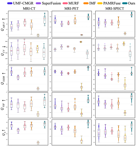 实验的比较对象是目前最先进的 5 种联合配准方法,包括 UMF-CMGR 、 superFusion 、 MURF 、 IMF 和 PAMRFuse 。其中除最后一组外,前 4 个均为非专门为多模态医学图像融合设计的方法,但已是目前最优的图像融合方法,且适用于 MMIF 。如下图所示: