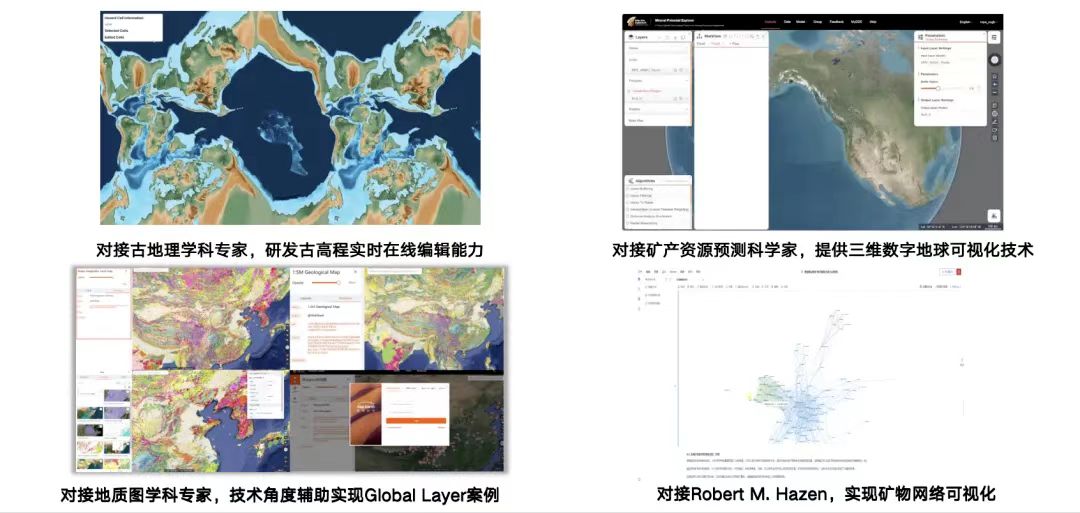 截至目前的时空汇聚版本,实现了深时演化、地学剖面、科研场景模拟等功能,辅助科学家在在线地图上开展地学时空分析,服务了古地理、古气候等学科,包括古温度、古降水都叠加在这个地图上进行动态播放,并在欧美(EGU 、 AGU 等)、日韩(IGC 等)、非洲(CAG)等地进行调研、演示,获得了国内外科学家的积极反馈。