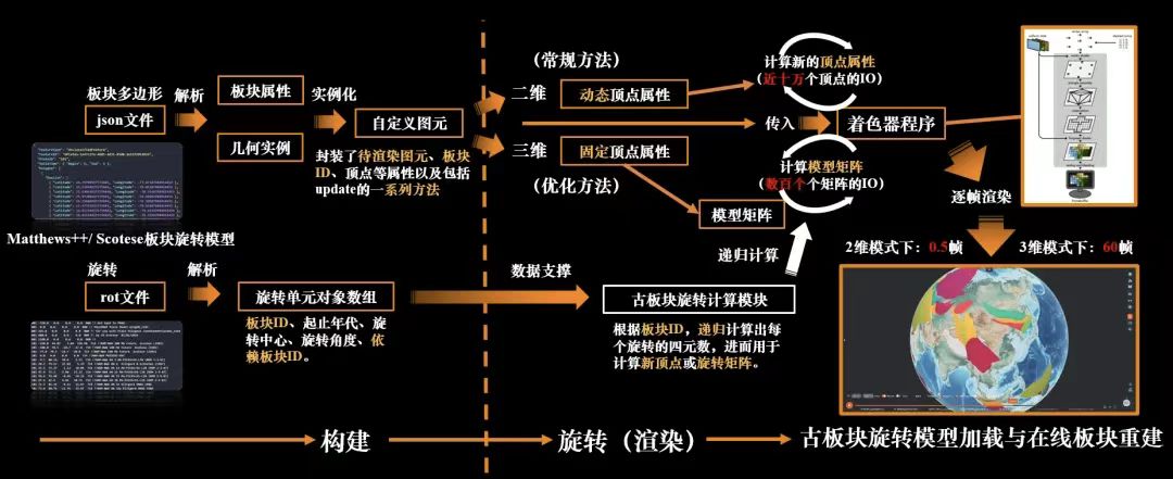 针对海量深时数据的高性能渲染的挑战,我们团队持续调研存在性能瓶颈的可视化场景,研发了地质板块重建运算与动态模拟技术。深时板块旋转是 EE 的标志性的功能,能够把现今的地球海陆分布通过动态旋转的形式,动态重建现在到 5.4 亿年前的古板块演化过程。
