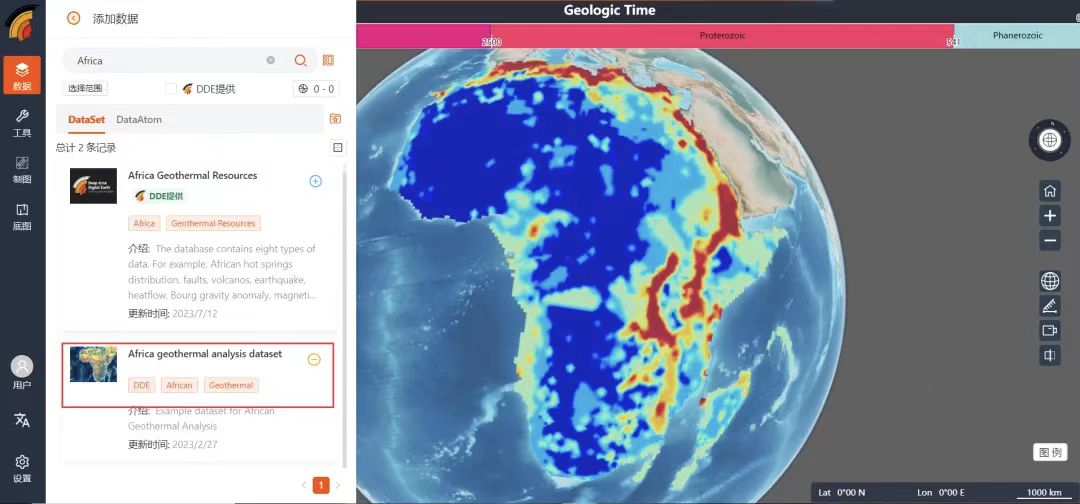 首先是「找数据」的功能,EE 在数据栏中预置了「明星数据」,如全球 1:500M 地质图、超高分辨率地貌图、深时古气候模拟数据集等。系统可以根据时间、空间还有关键词进行动态检索。对于一些具有在线链接但不公开提供的数据库,EE 也支持添加自定义数据链接,通过数据服务的形式实现数据在线加载。