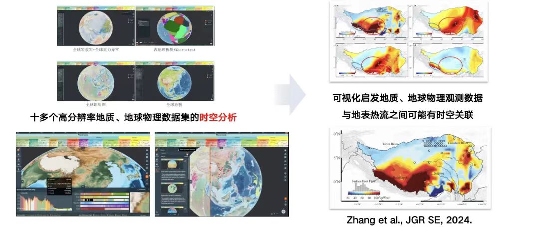 在科学家研究青藏高原地表热流时,EE 把莫霍面深度等 10 余个地质、地球物理数据集都加载到了青藏高原区域,通过平面+剖面的形式将青藏高原地表热流分布的潜在影响因素数据进行了可视化分析,进一步分析其分布规律,启发了研究思路,最终科学家采用空间回归分析开展了青藏高原地表热流分布的研究,成果已发表于 Journal of Geophysical Research-Solid Earth 期刊。