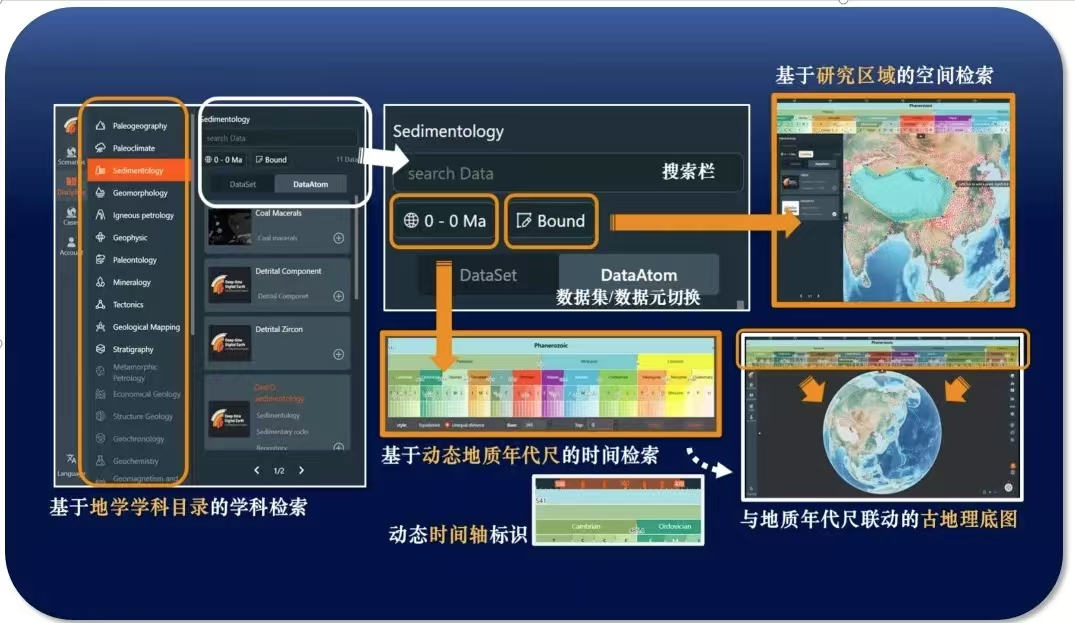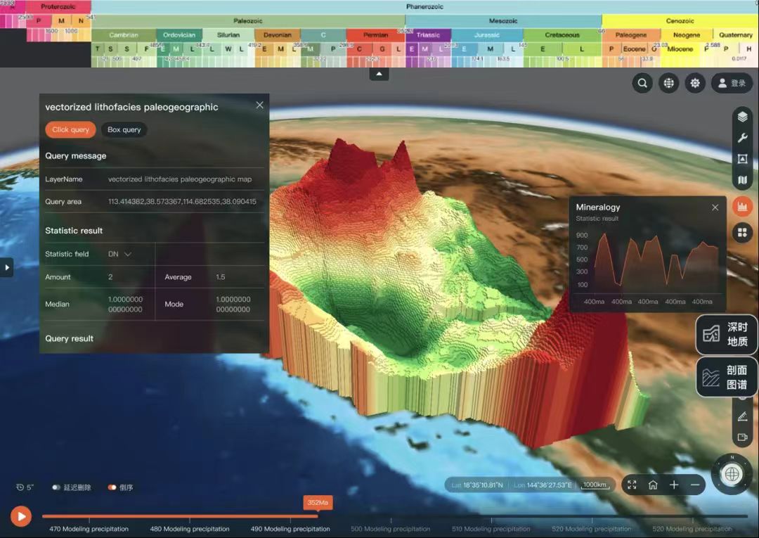 针对第一个问题,我们团队研发了时空联动的深时时间轴等工具,集成了古地理重建模型、时空穿刺检索等算法,实现了不同地质年代、不同地理分布数据的跨时空清晰展示,且用户所看到的任意数据,都可以在地质时间轴上找到其年代,为开展深时地学研究提供动态信息支撑。