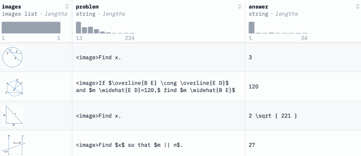 该数据集描述了丰富多样的几何问题,如求解角度、边长、面积、周长等,总共有 6,293 个文本项。图表用于辅助呈现几何问题中的图形信息,如各种几何形状(三角形、圆形、四边形等)及其相互关系,总共有 27,213 个文本项。