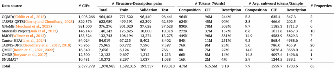 该数据集收录了约 197 万条晶体结构样本,来自 10 个公开材料数据库,涵盖 45 种不同的材料物理与化学属性,是迄今为止用于评估大型语言模型(LLM)用于材料性能预测的性能的最大基准。