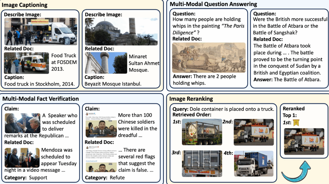 该数据集将图像和文本数据相结合,模拟真实场景中的信息检索与生成任务,例如新闻事件分析、视觉问答等,着重评估 MLLMs 在多模态上下文中利用检索文档知识的能力,包括对图像内容的理解、图文关联推理以及事实判断等方面。