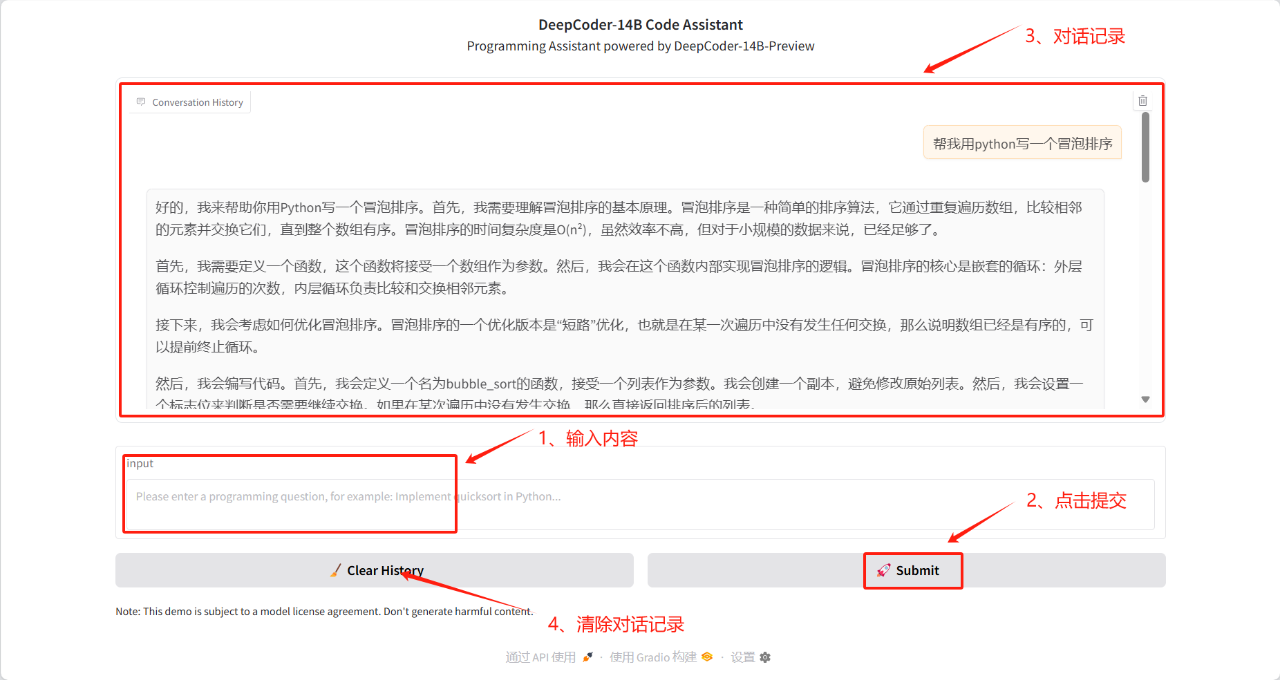 1. 一键部署 DeepCoder-14B-Preview DeepCoder-14B-Preview 在 LiveCodeBench v5 (8/1/24-2/1/25) 上实现了 60.6% 的 Pass@1 准确率,比基本模型(53%)提高了 8%,并且只用 14B 参数实现了与 OpenAI 的 o3-mini 相似的性能。 DeepCoder-14B-Preview 采用 bitsandbytes 提供的 8-bit 量化方法来优化显存占用。算力资源采用 RTX4090 。启动容器后点击 API 地址即可进入 Web 界面。