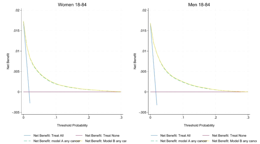 研究通过多项式逻辑回归模型对男女群体分别建模,不仅实现整体患癌概率预测,还首次实现肝癌、口腔癌等 15 种癌症类型的单独风险评估。在 500 万例独立验证中,新型算法表现出优于现有模型的区分能力、校准能力和敏感性,为优化临床决策流程、推进癌症早期诊断提供了科学依据。此外,该团队提出,该方法是初级保健中,首个用于估算当前尚未确诊的肝癌概率的算法。