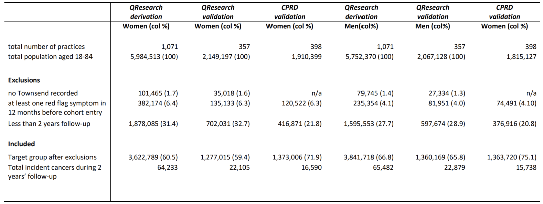 研究人群方面,如下图所示,英格兰 QResearch 诊所数据随机分配为开发队列(derivation cohort),共 7,464,507 人,包含 129,715 例新发癌症,验证队列(validation cohort)共 2,637,184 人,包含 44,984 例新发癌症,CPRD 验证队列共 2,736,726 人,包含 32,328 例新发癌症。