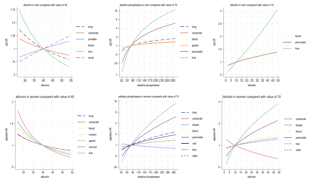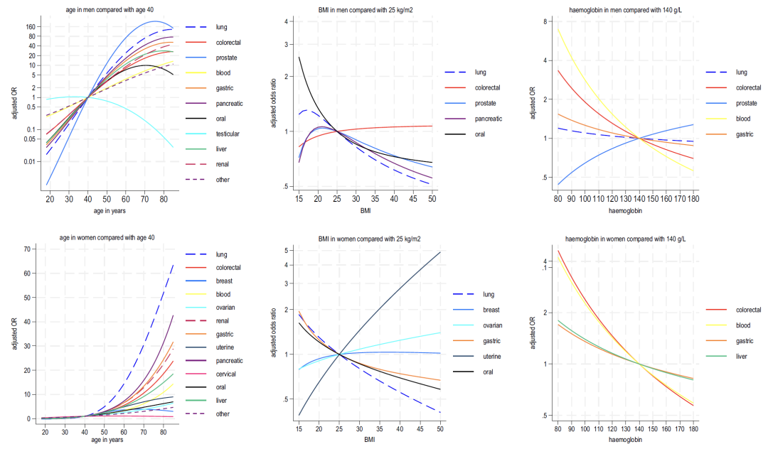 * 血红蛋白(haemoglobin):男性该指标下降与肺癌(lung)、结直肠癌(colorectal)相关,女性与结直肠癌(colorectal)、肝癌(liver)相关;