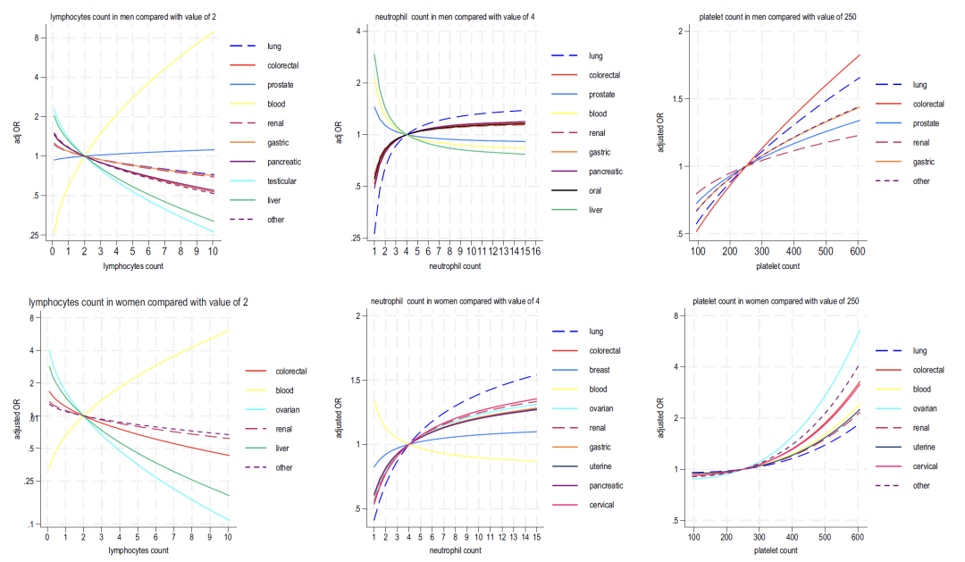 * 血小板(platelet):该指标升高与男女多种癌症正相关(男性结直肠癌、女性卵巢癌 ovarian 最强),且与中性粒细胞升高、淋巴细胞减少协同关联;