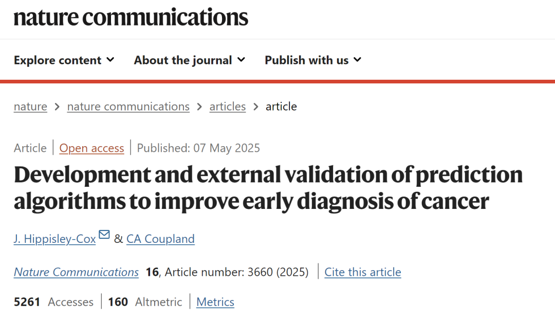 相关研究成果以「Development and external validation of prediction algorithms to improve early diagnosis of cancer」为题,已发表于国际权威期刊 Nature Communications 。