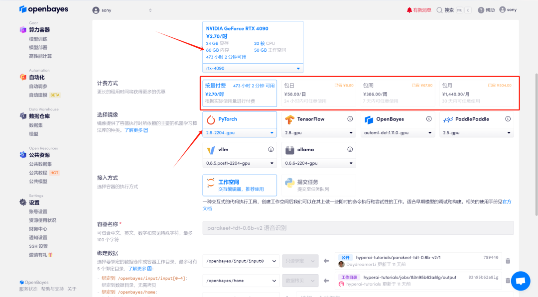 3. 选择「NVIDIA GeForce RTX 4090」以及「PyTorch」镜像,OpenBayes 平台提供了 4 种计费方式,大家可以按照需求选择「按量付费」或「包日/周/月」,点击「继续执行」。新用户使用下方邀请链接注册,可获得 4 小时 RTX 4090 + 5 小时 CPU 的免费时长!