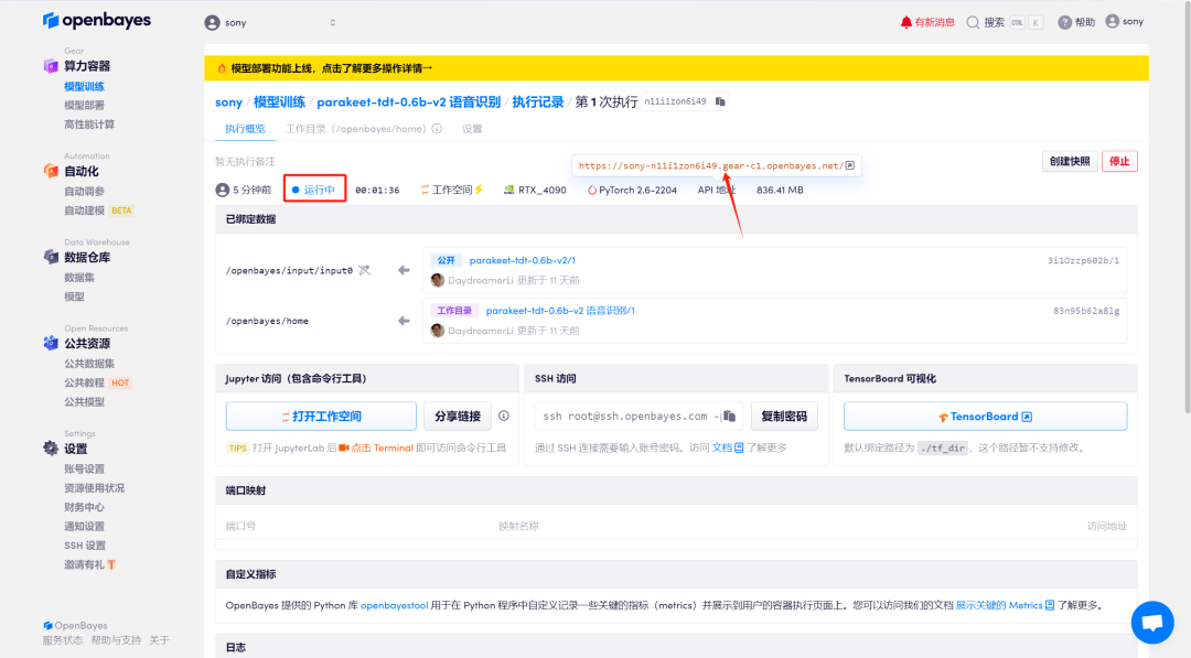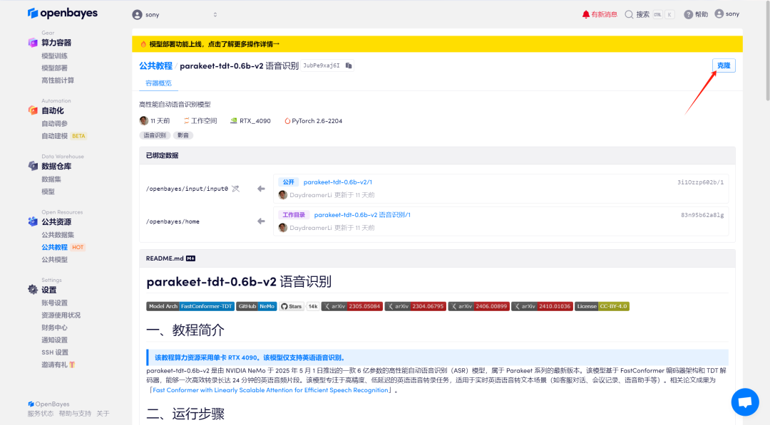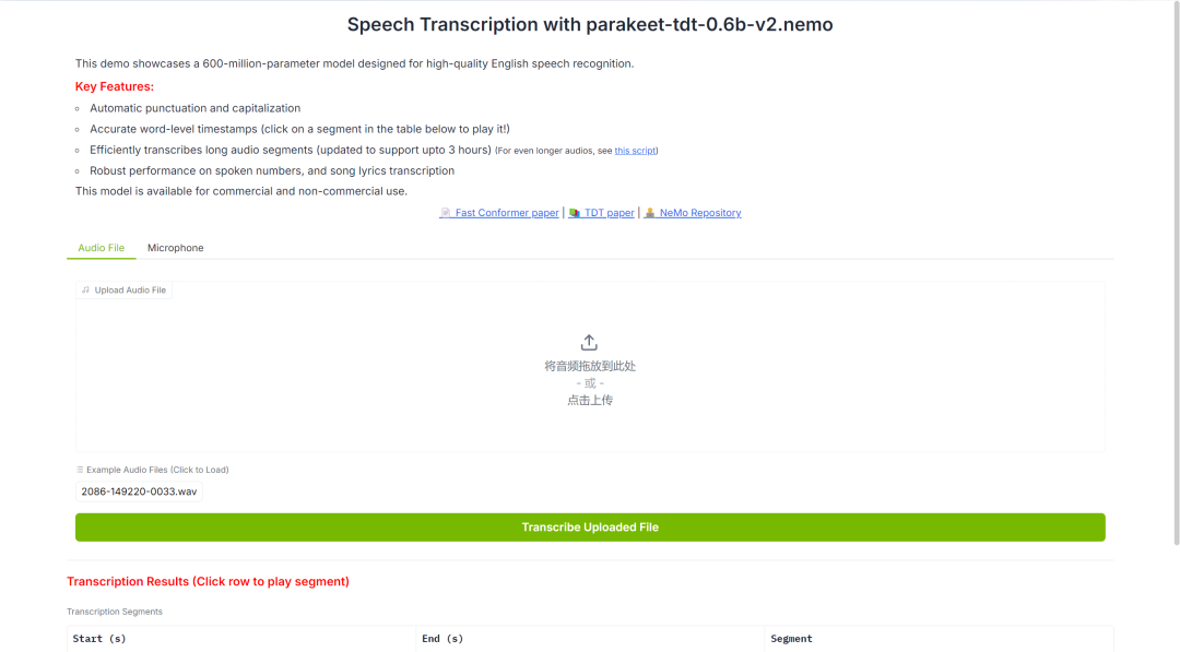 目前,「ParaKeet-tdt-0.6b-v2 语音识别」demo 已上线至 HyperAI 超神经官网的「教程」板块,点击下方链接即可体验一键部署教程