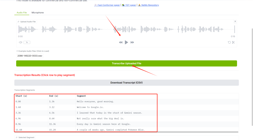 在「Upload Audio File」中上传音频文件,然后点击「Transcribe Uploaded File」识别。这里笔者上传了一段 Google I/O 主题演讲的音频,模型快速且准确地识别了出来。