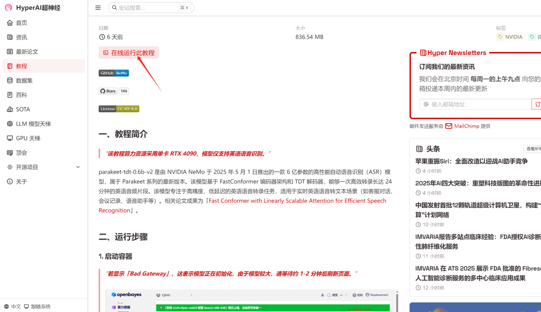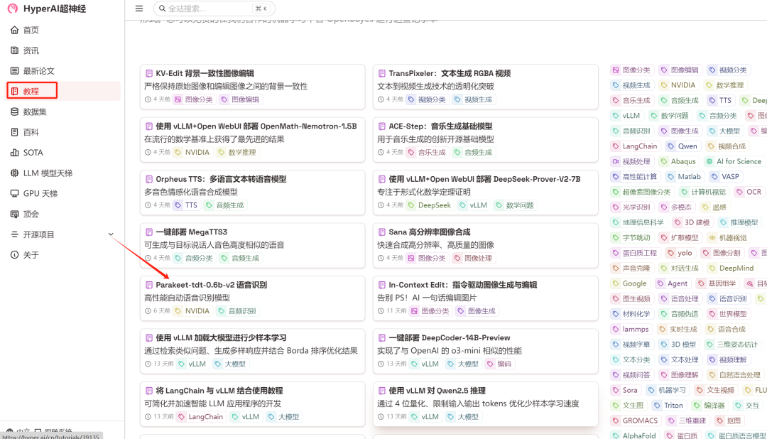 1. 进入 hyper.ai 首页后,选择「教程」页面,并选择「ParaKeet-tdt-0.6b-v2 语音识别」,点击「在线运行此教程」。