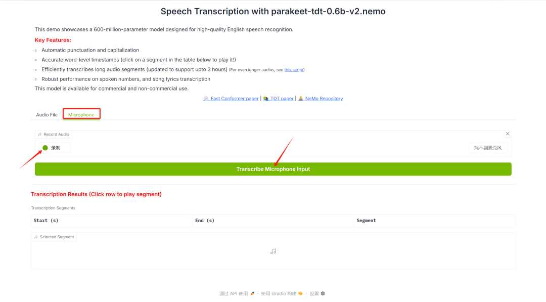 此外,ParaKeet-tdt-0.6b-v2 还支持语音输入。点击「Microphone」,然后点击「录制」,录制完成后点击「Transcribe Uploaded File」识别。