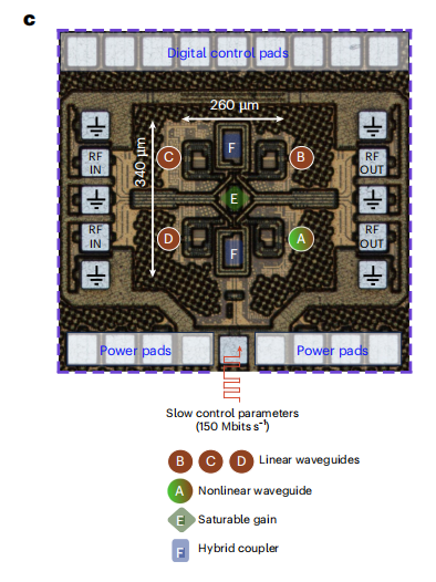 MNN 微芯片的整体构造如下图所示。作为一款可同时处理超高速数据和无线通信信号的低功耗、轻量化集成电路,研究团队将其称为「一个以大脑为模型的计算系统」。其核心由一个非线性波导(标记为 A)和三个线性波导(分别标记为 B 、 C 、 D),以及增益单元(标记为 E)和耦合器(标记为 F)组成。