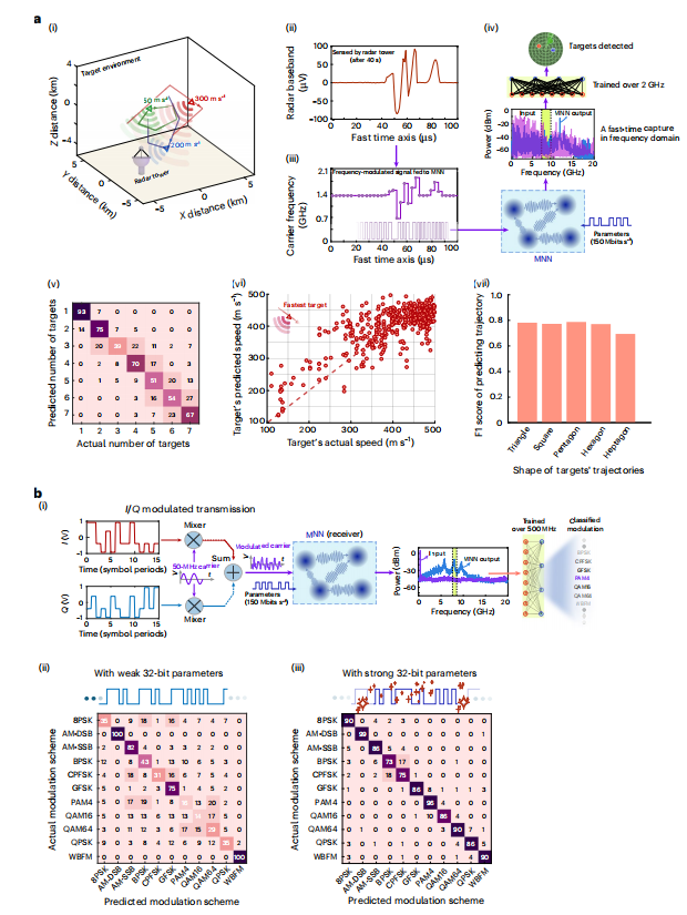 * 与依赖于数字时钟的传统神经网络不同,MNN 在微波频段利用模拟、非线性行为,可处理数十吉赫兹的数据流,且功耗低于 200 毫瓦,精度达 88%