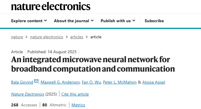 相关研究成果以「An integrated microwave neural network for broadband computation and communication」为题,发表于 Nature Electronics 。