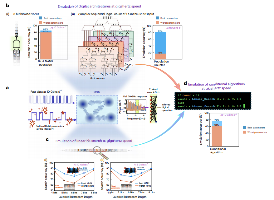 另外,MNN 还被证明可在 10 Gbit/s 的数据流中执行比特序列搜索,具有非常高的准确率,这为传统通信中的高功耗最大似然序列检测(Maximum Likelihood Sequence Detection, MLSD)技术提供了替代方案。同时,通过组合搜索和技术功能,MNN 成功模拟了一个条件算法,在保持低于 200 毫瓦功耗(176 毫瓦)的同时实现了 75% 的准确率。
