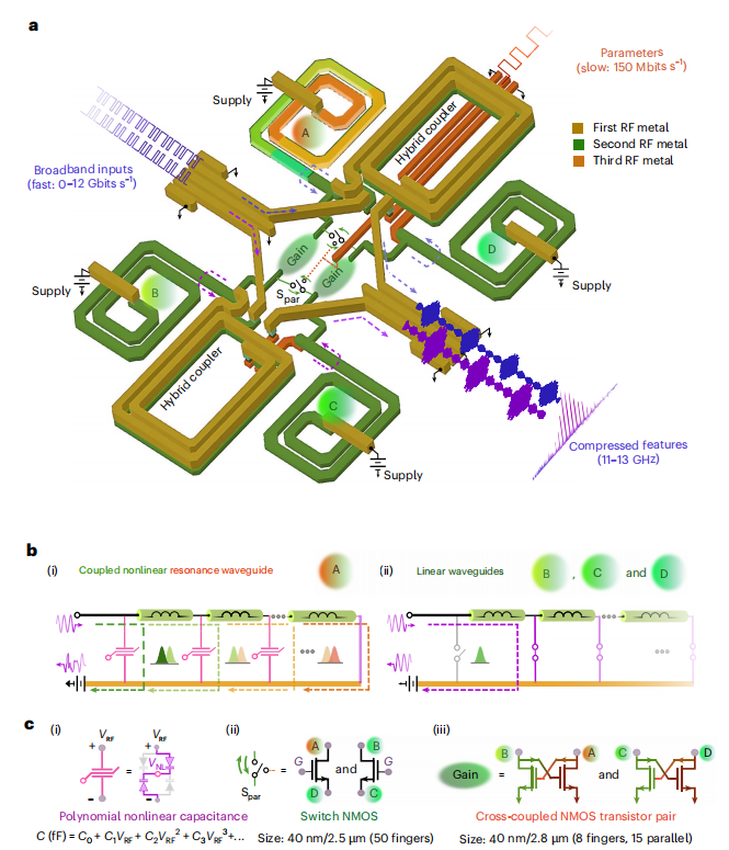 具体来说,MNN 是一个非线性系统(下图为其工作机制)。该系统通过 GSGSG(接地-信号-接地-信号-接地)波导注入千兆赫速度的信号,然后利用两个重叠金属层构建的微型正交混合耦合器将这些输入信号的功率分配到各个波导,这些较小部分的驱动信号随后从波导反射回来并在耦合器的输出端口叠加,最终再通过另一组 GSGSG 波导提取出来。