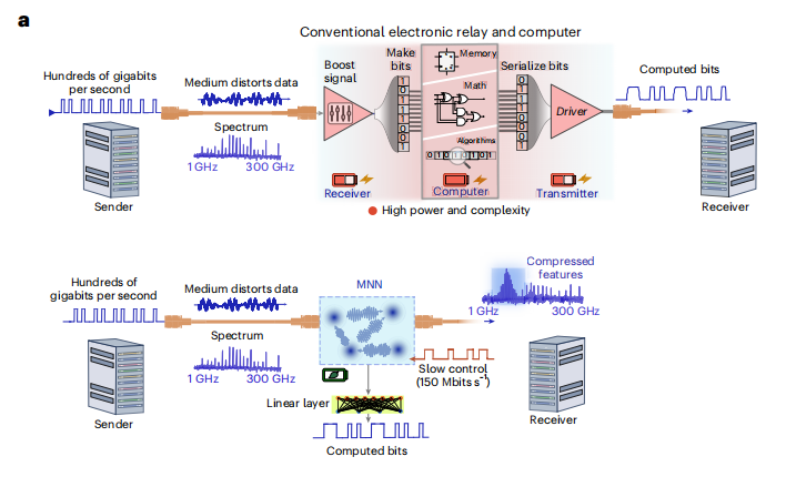 然而高带宽应用对应的高性能计算成本正日益高昂。其所需的采样和处理时钟速率受到半导体物理特性和功率限制的双重约束,导致速率越高,功耗和散热压力就会越大。如数据中心中采用的传统电子信号处理链中,信号经过有损耗的介质传导时,需要被精确计时和采样,然后通过复杂的同步电路重建传输、恢复完整性,才能确保信息准确传递至下一个节点。这一过程依赖大量耗电的并行处理,成为制约效率提升的关键瓶颈。